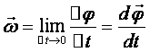Угловая скорость ω - векторная физическая величина, показывающая, как изменяется угол поворота в единицу времени и численно равная первом производной от угла поворота по времени.