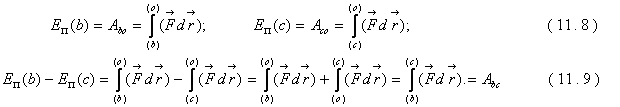 На рис.11.3 мы представили три точки в пространстве поля консервативных сил: точку (b), точку (с) и точку (о), потенциальную энергию в которой будем считать равной 0. Обозначим через Abo работу, которая совершается при переносе тела из точки (b) в точку (o). Если перемещать тело из точки (o) в точку (b), то совершаемая при этом работа будет равна Aob=-Abo, поскольку меняется направление движения, но не меняются действующие на тело силы. Работу по перемещению тела из точки (c) в точку (o) будем обозначать, как Асo. Точно также Асо=-Аос. При перемещении тела из точки (b) в точку (c) совершается работа Abc=-Acb. Согласно определению потенциальной энергии и формуле (11.3) для вычисления работы имеем: