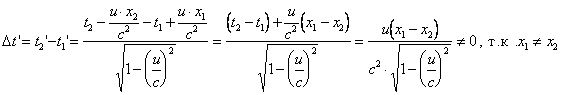 К этому же результату можно прийти и чисто формально, при помощи преобразований Лоренца. Покажем это. Пусть в неподвижной системе отсчета К два события происходят одновременно, т.е.