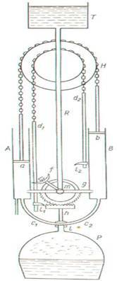 Машина Ползунова имела два цилиндра А и В с поршнями а и b, расположенными, как показано на рисунке. Штоки поршней были соединены цепью, перекинутой через шкив Н. Движение шкива H передавалось стержням d1 и d2, которые с помощью «ладоней» L1 и L2 передвигали серповидный маятник f.