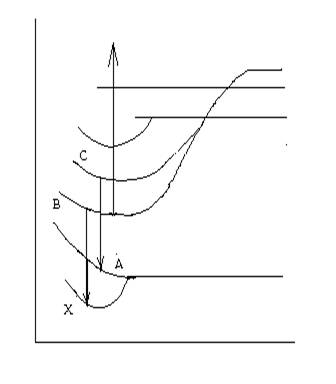 В общем виде структура молекулы галогенидов инертных газов представлена на рис.1 . Основное состояние является ковалентно связанным и при бесконечно большом межъядерном расстоянии коррелирует с основным состоянием 2Р атома галогена. Вследствии особого характера Р-оболочки атома галогена (суммарный орбитальный момент количества движения равен 1), основное состояние системы состоит из двух подуровней. Один из них, 2S, обладает наименьшей энергией, поскольку в этой конфигурации единственная орбиталь галогена занята и примыкает непосредственно к атомам инертного газа. Такое состояние системы называется основным или Х-состоянием. В общем случае ему соответствует почти горизонтальная потенциальная кривая или в крайнем случае оно является слабосвязанным. Терм 2П основного состояния всегда отталкивательный. Поскольку он представляет собой наинизшее возбужденное состояние, будем называть его А-состояние.