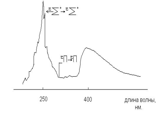 В длинноволновой области спектра полосы расположена широкая область континиума, соответствующая переходам на отталкивательный уровень А (2П) нижнего электронного состояния. Спектр излучения любой из полос связан с переходом валентного электрона от отрицательного иона галогена (верхнее состояние). То что, переход В(2S)®Х(2S) является самым интенсивным объясняется тем, что из всех валентных орбиталей начальная и конечная рs-орбитали этого электронного перехода наиболее сильно перекрываются [4]. Поскольку D--состояние расположено выше самого нижнего возбужденного (ионного) состояния примерно на одну и ту же величину энергии независимо от межядерного расстояния, полоса D®Х оказывается смещенной в голубую часть спектра по сравнению с полосой перехода В®Х. В случае молекулы Кr2F излучение в полосе D®Х происходит на длине волны около 220 нм, и на рис.2 не указанo. Переходы на 2П-термы основного состояния являются существенно менее интенсивными и образуют относительно широкий континуум, поскольку нижний уровень является отталкивательным. На риc.2 широкий спектр излучения Кr2F простирается по обе стороны от центра, расположенного вблизи 400 нм.