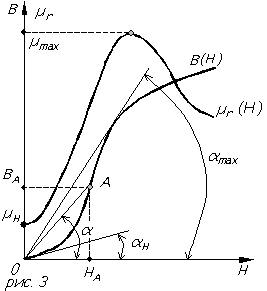 Кривая изменения магнитной проницаемости mr для ферромагнитного материала дана на том же рис. 3. Как видно из графика, магнитная проницаемость с ростом напряженности поля изменяется в весьма широких границах, что затрудняет ее применение для расчетов. На кривой mr(H) отмечают два характерных значения магнитной проницаемости: