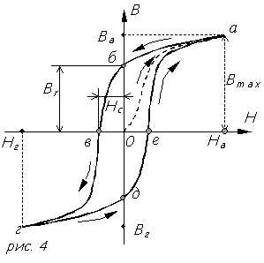 магнитная индукция увеличивается по кривой начального намагничивания (Оа) и достигает соответствующего максимального значения Ba. Если затем ток и напряженность поля уменьшаются, то и магнитная индукция уменьшается, при соответствующих значениях напряженности магнитная индукция несколько больше, чем при увеличении напряженности. Кривая изменения магнитной индукции (участок aб на рис. 4) располагается выше кривой начального намагничивания. При нулевых значениях тока и напряженности поля магнитная индукция имеет некоторое значение Br, называемое остаточной индукцией (отрезок Об на рис. 4).