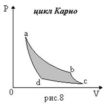 В двигателе Карно используется одноименный цикл (рис.8). В точке а начальное состояние системы. Сначала газ расширяется изотермически и обратимо по пути ab при заданной температуре TH, например газ приходит в контакт с термостатом, имеющим очень большую теплоемкость. Затем газ расширяется адиабатически и обратимо по пути bc, при этом передача теплоты практически не происходит и температура газа падает до более низкого значения TL.