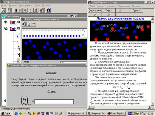 Рис. 1 Общий вид программы с открытой моделью «Лазер: двухуровневая модель»,задачей на эту тему и теорией по теме.