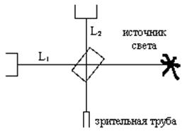 Оптический прибор - знаменитый интерферометр Майкельсона - размещался на тяжёлой каменной плите, которая плавала на ртути в бассейне в подвале здания. Ориентируя этот прибор либо плечом L1 либо плечом L2 вдоль направления движения Земли, не удалось наблюдать какого-либо различия в его показаниях (это различие должно было выразиться в смещении интерференционных полос, наблюдаемых в зрительную трубу), т.е. не удалось измерить скорость V движения Земли в межпланетном пространстве.