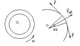 Рассмотрение проведем в неинерциальной системе отсчета, вращающейся вместе с обручем с угловой скоростью w, в которой обруч покоится. В этой системе любая малая часть обруча тоже покоится. Рассмотрим бесконечно малый элемент обруча, стягиваемый центральным углом da. Кроме реальных физических сил, действующих на этот элемент обруча (к которым относятся силы F, действующие со