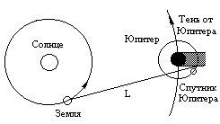 На рисунке L обозначает расстояние между Землей и спутником Юпитера в тот момент, когда он входит в тень Юпитера. Момент затмения наблюдается на Земле с запаздыванием, равным Dt=L/c, где c - скорость распространения света в межзвездной среде - эфире. Очевидно время запаздывания минимально или максимально, когда расстояние между Юпитером и Землей, соответственно, минимально или максимально.