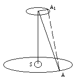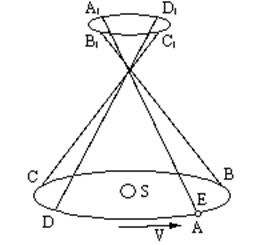 где f - угол ASM, который равен f =2pt/T3 , где t- время, протекающее с момента, когда Земля находилась в точке A своей орбиты, T3 - период обращения Земли вокруг своей орбиты. В течение полугода, когда Земля перемещается вдоль пути ABC, изменение периода варьируется от DT=0 в точке A до максимального значения DT=T0v/c в точке B и вновь до значения DT=0 в точке C .