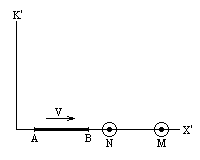 Мгновенным точечным событием теперь можно считать событие, заключающееся в совпадении, например, левого конца A стержня с фиксированной точкой N оси x. Другим мгновенным точечным событием является совпадение в какой-то момент времени правого конца B с фиксированной точкой M на оси x.