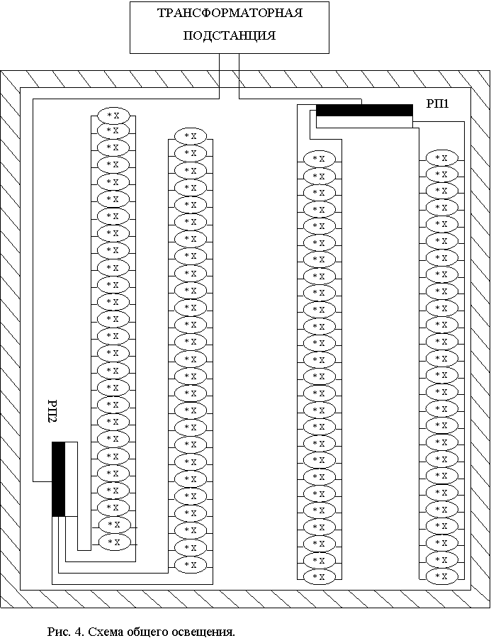 Используя данные о размещение производственного оборудования в помещении цеха, следует разместить светильники общего рабочего освещения, определить их число n и тип.