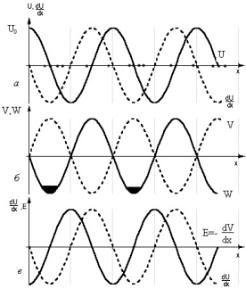 Таким образом, при движении акустической волны в местах сжатия повышается плотность положительного заряда, а в местах растяжения – плотность заряда уменьшается. Вследствие этого возникает периодическое распределение потенциала V вдоль цепочки с максимумами в областях сжатия. Изменение потенциала вдоль цепочки с максимумами в областях сжатия. Изменение потенциала вдоль цепочки для фиксированного момента времени оказано пунктирной кривой на рис. 6.17 б, а изменение потенциальной энергии W= –eV изображено сплошной линией.