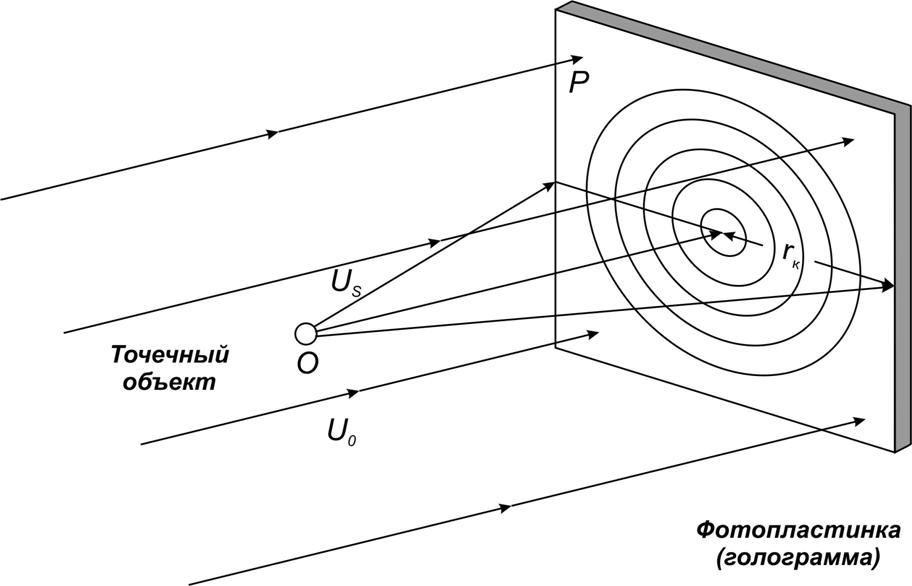 При облучении плоской волной точечный объект, согласно принципу Гюйгенса-Френеля, рассеивает сферическую волну