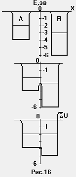 Это явление можно объяснить используя диаграммы потенциальных ям. Рассмотрим два различных металла А и В ( рис.16а). Пусть уровень Ферми в металле А составляет - 2 эв, а в металле В - 3 эВ; при этом потенциальная энергия электронов внутри металла А равна - 4 эВ, а внутри металла В - 6 эВ ( все эти энергии измеряются относительно энергии покоящегося электрона, находящегося вне металла). На рис. 16б показано, что происходит сразу после того, как оба металла были приведены в соприкосновение. Электроны из металла А могут перейти в металл В, где имеются свободные состояния с более низкой энергией. Но как только электроны перейдут в металл В, он приобретет отрицательный заряд по отношению к А. Теперь уже, чтобы отрицательный заряд мог попасть в отрицательно заряженный металл В, требуется совершить большую работу; это означает, что диаграмма потенциальной энергии металла В сместится вверх относительно диаграммы металла А. Это сещение будет происходить до тех пор, пока уровни Ферми не сравняются ( рис.16в). Такое равновесие достигается после того, как очень небольшая часть электронов проводимости перейдет изА в В. Из рис.16в следует, что разность потенциальных энергий DU равна исходной разнице в уровнях Ферми; таким образом, если уровни Ферми двух металлов различаются на 1 эВ, то при соединении этих металлов между ними возникнет разность потенциалов 1В.