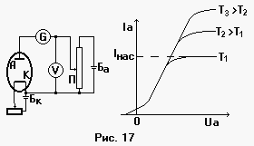 При постоянном токе накала катода кривая зависимости силы анодного тока Ia от анодного напряжения имеет вид, показанный на рис .17. Эта кривая называется вольт-амперной характеристикой диода. Различные кривые на рис.17 соответствуют разным температурам катода.