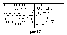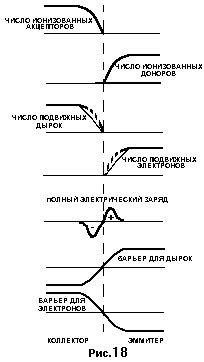 На рис.18 изображено состояние р-n перехода в тот момент, когда между указанными процессами установится равновесие. Вблизи перехода образуется двойной слой электрического заряда, так как диффузия подвижных зарядов оставляет неподвижные заряды частично нескомпенсированными; двойной слой препятствует дальнейщей диффузии. Можно сказать, что наличие двойного слоя эквивалентно потенциальному барьеру, который диффундирующим подвижным зарядам необходимо преодолеть, причем для электронов и дырок барьер обращен ступенькой в противоположные стороны.