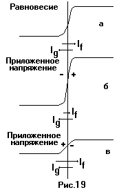 На рис. 19а показано, что происходит с дырками перед тем как произошло подключение батареи. Несмотря на отталкивание положительным ионным зарядом, дырки из р-области диффундируют через переход слева направо; с этим движением связан ток If. Дырки возникающие за счет теплового возбуждения в n-области, создают встречный ток Ig, полностью компенсирующий ток If.