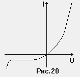 Изменение высоты барьера очень мало влияет на величину тока Ig. Этот ток зависит от скорости, с которой образуются дырки при тепловом возбуждении атомов в n-области, и от того, как долго им удается уцелеть во “враждебном окружении”( точнее , успеют ли образовавшиеся дырки продиффундировать к краю барьера). Однако изменение высоты барьера может существенным образом повлиять на величину тока If. Результирующий, или суммарный, ток через р-n переход как функция приложенного к нему напряжения показан на рис.20. Видно, что при повышении напряжекния ток резко возрастает, если электрическое поле “ опускает” барьер; при обратном способе включения батареи ток ( обратный) сначала тоже возрастает с ростом напряжения, однако гораздо медленнее; наконец при достаточном поднятии барьера дальнейшее возрастание тока вовсе прекращается. Окончательное значение тока - ток насыщения - устанавливается в тот момент, когда практически ни одна дырка не в состоянии преодолеть энергетический барьер; ток насыщения в точности равен току Ig. Лишь при очень большом обратном напряжении сила тока начинает резко возрастать, что обусловлено электрическим пробоем перехода (левая ветвь). Каждый р-n переход характеризуется своим предельным значением обратного напряжения, которое он способен выдержать без разрушения.
