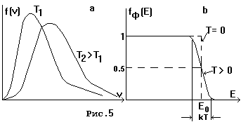 Величину Еf называют химическим потенциалом системы частиц или энергией Ферми. Если Еf>0, то эта величина имеет простой физический смысл. Из (5) видно, что при Е=Еf плотность заполнения состояния dN/dZ = fф(E)= 1/2. Следовательно, Еf есть та энергия, для которой плотность заполнения состояний равна половине. При Е>Еf, очевидно, dN/dZ<1/2, а при E<Ef плотность заполнения dN/dZ>1/2 (см.рис.5б). При Т=0 Ef - это максимальная энергия заполненного уровня.
