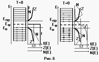 Поскольку в первом приближении эффективные массы электронов и дырок одинаковы, следовательно, в собственном полупроводнике уровень Ферми лежит посередине запрещенной зоны ( см. рис.6). Если принять, что ширина запрещенной зоны для полупроводников DE ~1эВ, то приближение ½E-Еf½/kT >>1, которое мы использовали, справедливо при нормальных температурах ( 1эВ » 11000 К). На рис.6 показаны функции f(E), Z(E) и N(E) для температуры Т=0 К и Т¹0 К.