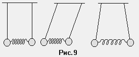 Рассмотрим одно интересное свойство связанных осцилляторов. Представим себе, что произойдет, если мы свяжем два в точности одинаковых маятника очень слабой пружиной (рис.9). Если мы одновременно отклоним оба маятника в одном направлении - каждый на один и тот же угол от положения равновесия, - а затем отпустим их, они будут колебаться с одинаковой частотой причем пружинка не будет оказывать на них никакого действия, так как она не деформируется при движении маятников в фазе.