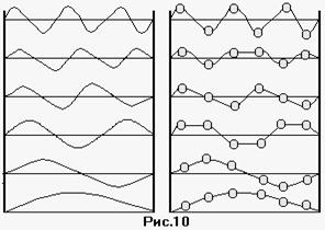 Аналогичнло цепочка с большим числом одинаковых связанных маятников может колебаться с большим числом различных частот, равным числу маятников. При этом некоторые из этих частот будут выше, а некоторые ниже собственной частоты колебаний маятников. На рис.10 представлены возможные типы колебаний натянутой упругой струны и их аналог в системе шести одинаковых равномерно распределенных масс (модель кристалла). Чистый тон называют основным; другие частоты носят названия гармоник (на рисунке их пять). Фактически речь идет о стоячих волнах. Из приведенного рис. видно, что других частот у шести маятников быть не может.