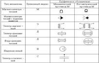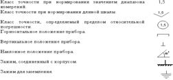 На циферблаты, щитки и корпуса измерительных приборов наносятся обозначения, определяющие назначение прибора, тип измерительного механизма, род тока, класс точности, рабочее положение и др.