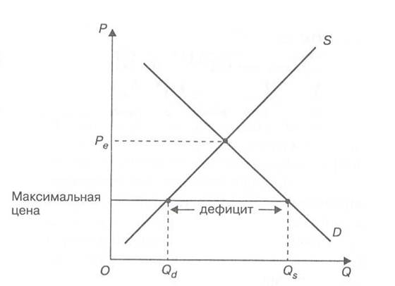 Не редко можно встретиться и с установлением верхнего придела цены (ценовым потолком). Если верхний придел цены установлен выше рыночной, то никаких серьёзных изменений не произойдёт, но верхний придел цены устанавливается для ограничения роста цены и устанавливается ниже цены рыночного равновесия. Как правило, это делается для поддержания беднейших слоёв населения и для установления справедливости распределения товара. Например, во время войны или голода правительство может устанавливать максимальные приделы цен на основные товары для того, чтобы бедные слои населения могли приобрести их. При уменьшении цены уменьшается и предложение, но спрос при этом возрастает а, следовательно, возникает дефицит. Складывающаяся ситуация на рынки изображена на Рис.2.3.