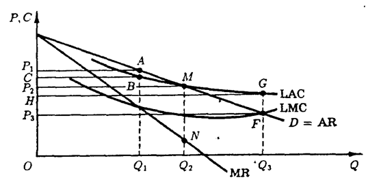 Но, как мы знаем, выпуск Q1 «слишком мал», а цена P1 «слишком высока». Заметим, что наиболее целесообразным для общества был бы выпуск Q3 и цена P3, на что монополист не пойдет. Поэтому регулирующий орган должен бы установить на продукцию этой монополии цену Р3 = LMC(Qз) = AR(Q3). Проблема в том, что такая цена не возместила бы затрат на производство продукции, она оказалась бы ниже средних затрат при объеме производства Q3, P3 < LАС (Qз) = GQ3 = ОН. В итоге монополист, производящий оптимальный с точки зрения общества объем продукции Q3, получал бы отрицательную прибыль (убыток), равную площади P3HGF . Чтобы монополия не покинула рынок, необходимо было бы предоставить ей дотацию в размере, по крайней мере равном той же величине P3HGF. Но, как мы знаем, предоставление дотаций может привести, хотя и не обязательно, к чистым потерям для общества.