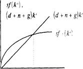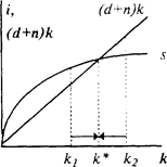 Отметим, что с увеличением темпа роста населения возрастает угловой коэффициент кривой (d+n)k , что приводит к уменьшению равновесного уровня фондовооруженности (k′*), следовательно, к падению у.