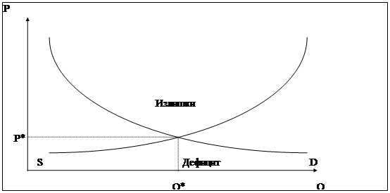 Пересечение кривых спроса и предложения определяет цену равновесия (или рыночную цену) и равновесное количество продукции(рисунок 9). Любую другую цену конкуренция делает неустойчивой.