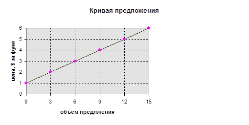Рис. 1. Кривая предложения. Цены и соответствующие объемы предложения из таблицы 1 можно изобразить в виде точек, чтобы получить представленную здесь кривую предложения. Например, точка А показывает, что если цена составляет 4 $ за фунт, то для продажи будет предложено 9 млн. фунтов в месяц. Кривая предложения направлена вверх ( является возрастающей функцией) , показывая тем самым, что с увеличением цены то же происходит с объемом предложения.