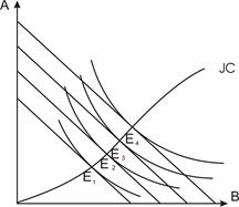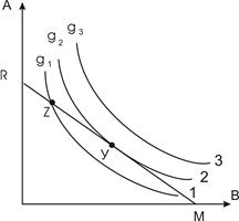 Выбор осуществляется лишь в пределах прямоугольника ОТВЕ1IА. Т.о. выбор осуществляется не в абстрактной точке максимальной полезности Е, а в точке достаточной полезности Е2. В идеале наиболее оптимальный выбор при совпадении точки касания кривой безразличия с бюджетной линией с точкой Е1. Однако на практике избирается вариант Е2, позволяющий сохранить запас дохода и времени, а иногда Е3 – случайность в аспекте времени и информации, использование заемных средств – в аспекте дохода.