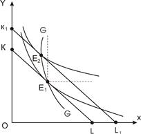 При каждом уровне дохода потребитель будет выбирать оптимальный набор благ. При соединении точек касания бюджетных линий с кривыми безразличия получим кривую доход-потребление. Чаще всего эта кривая имеет положительный наклон. Такие товары называются нормальными. Однако она может иметь и отрицательный наклон. Это характерно, когда с увеличением дохода потребитель начинает больше покупать один товар Y (качественный) за счет снижения объема потребления другого товара X (некачественного).