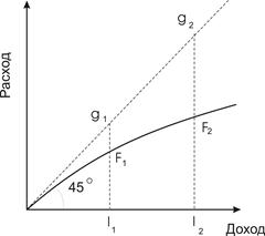 При отложении на оси абсцисс дохода, а на оси ординат – величину расхода, получим кривую доход-расходы (кривая Энгеля). Энгель впервые подметил, что чем меньше доходы, тем большая часть тратится на питание. Это положение вошло в историю экономической науки как закон Энгеля.