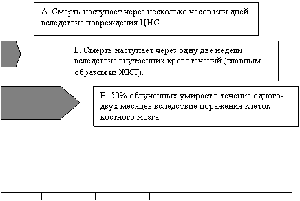 При облучении экспозиционной дозой более 600 Р. развивается крайне тяжелая четвертая степень лучевой болезни, которая без лечения обычно заканчивается смертью в течение двух недель.