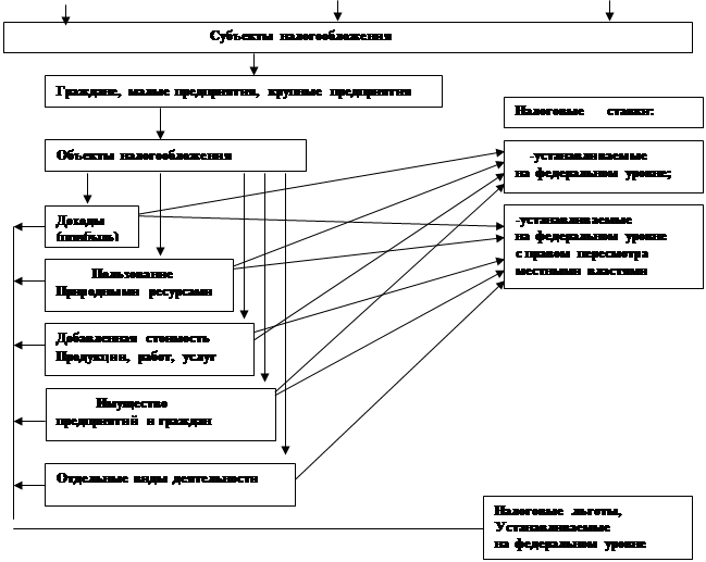 На приведенной, на рис.1, схеме показаны отношения между субъектами и объектами налогообложения, плательщиками налогов и уровнями, на которых устанавливаются налоговые ставки, льготы и порядок уплаты налогов.