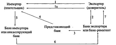 1. Экспортер заключает контракт с импортером о продаже товаров на условиях расчетов по документарному инкассо и отправляет ему товар (1а). 2. Экспортер направляет своему банку инкассовое поручение и коммерческие документы. 3. Банк экспортера пересылает инкассовое поручение и коммерческие документы представляющему банку (или банку импортера). 4. Представляющий банк предъявляет эти документы импортеру. 5. Импортер производит оплату документов инкассирующему (или своему) банку. 6. Инкассирующий банк переводит платеж банку-ремитенту (или банку экспортера). 7. Банк-ремитент зачисляет переведенную сумму на счет экспортера.