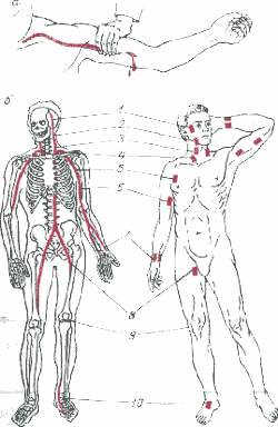 Рис. 9. Схема артериальной сети человека и точки пальцевого прижатия артерий для остановки кровотечений.