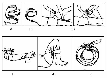 а — ленточный кровоостанавливающий жгут; б—круглый кровоостанавливающий жгут; в—наложение кровоостанавливающего жгута; г — наложение закрутки; д — максимальное сгибание конечности; е — двойная петля брючного ремня.