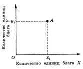 Итак, пусть потребитель сталкивается только с двумя благами, Х и У. Тогда любая из возможных комбинаций благ (например, комбинация А, содержащая х, единиц блага Х и у1 единиц благ Y) может быть представлена в виде точки на графике (рис. 2), где по оси абсцисс откладывается количество единиц блага X, а по оси ординат - количество единиц блага Y.