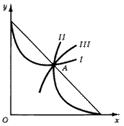 Рис. 17. Кривые цена-потребление для товара Х (I), товара Y (II) и кривая доход-потребление (III).