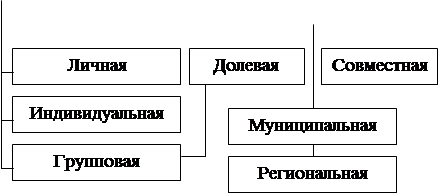 Промежуточное место между частной и государственной занимает общая собственность нескольких субъектов. Согласно Гражданскому кодексу Российской Федерации общая собственность подразделяется на совместную и долевую. Общая совместная собственность принадлежит всем собственникам вместе и не делится между ними на части. Общая долевая собственность разделена на доли, части. В кооперативах, товариществах долю каждого собственника именуют паем. Во многих случаях долевая собственность распространяется только на стоимость объекта собственности, она дает право участвовать в управлении объектом, но при этом собственник не может изымать свою долю в материальной, вещественной форме, забрать «свой кусок».