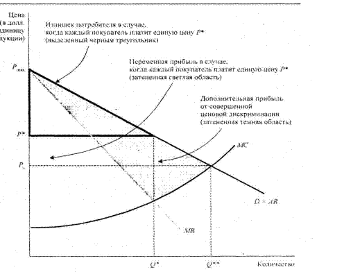 Ценовая дискриминация, однако, не влияет на структуру издержек фирмы, и издержки на производство каждой дополнительной единицы продукции, как и прежде, представлены кривой предельных издержек фирмы. Следовательно, в этом случае прибыль от производства и сбыта каждой дополнительной единицы продукции равна разнице между ее ценой, определяемой по кривой спроса и предельными издержками. До тех пор, пока цена превышает предельные издержки, фирма имеет возможность увеличивать прибыль, расширяя производство. Фирма так и будет поступать до тех пор, пока не достигнет объема производства Q**. При Q** цена равна предельным издержкам, и дальнейшее увеличение производства приведет к падению прибыли.