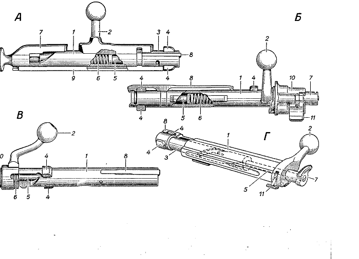 А — с поворачивающейся рукояткой, расположенной в средней части стебля затвора (винтовка Мосина 1891 г., Россия, СССР); Б, В — с поворачивающимися рукоятками, расположенными в задней части стебля затвора (соответственно винтовки Маузера 1898 г, Германия, и MAC-36, Франция); Г— с рукояткой, имеющей только прямолинейное движение (Манлихер, 1895 г., Австро-Венгрия). Винтовые пазы с пологим шагом, расположенные на боевой личинке (внутри стебля затвора, показаны пунктиром), при взаимодействии с выступами внутри стебля затвора обеспечивают повороты боевой личинки при открывании и закрывании затвора: 1 — стебель; 2 — рукоятка; 3 — боевая личинка; 4 — боевые выступы; 5 — ударник; 6 — боевая пружина; 7 — курок; 8 — выбрасыватель; 9 — соединительная планка; 10 — соединительная муфта; 11 — предохранитель.