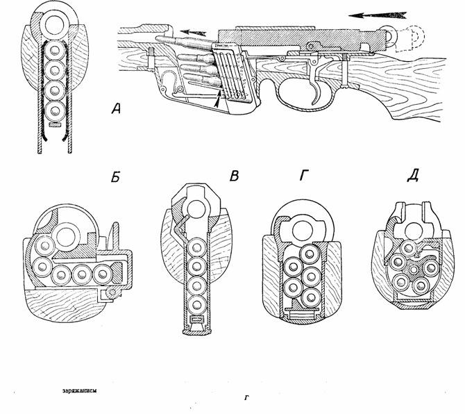 А — с пачечным заряжанием (справа — момент досылания патрона); Б — с горизонтальным расположением патронов, наполнение по одному патрону; В — с вертикальным однорядным расположением патронов, наполнение из обоймы; Г— с двухрядным (шахматным) расположением патронов, наполнение из обоймы; Д— барабанный, наполнение из обоймы.