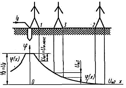 человеком и одиночным заземлителем. Напряжение шага наибольшее в положении 1 человека, когда он стоит одной ногой на заземлителе. В положении человека между заземлителем и зоной нулевого потенциала, когда шаг направлен по радиусу к заземлителю, напряжение шага имеет промежуточное значение.