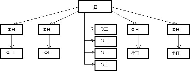 Д- директор; ФН - функциональные начальники; ФП - функциональные подразделения; ОП – основные производственные подразделения Рис. 1.1.3. Линейно-функциональная структура управления