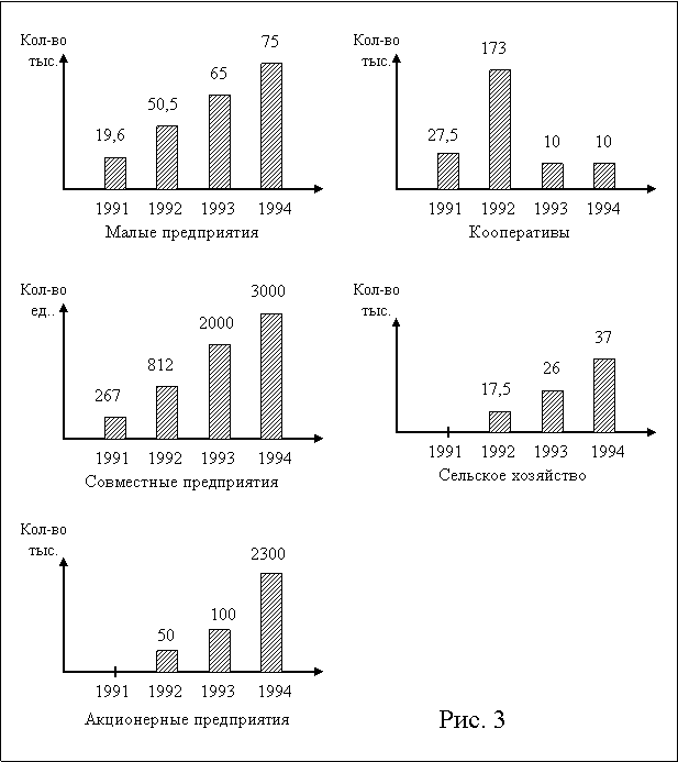 Например, объем производства малых предприятий Украины в 1993 году равен 15200 млрд.крб., а количество работающих в 65 тыс. предприятий составило 1000тыс. человек. В кооперативах объем услуг и работ за этот период составил 3200 млрд.крб., а количество работающих в 10 тыс кооперативов равно 200 тыс. человек. Акционерных предприятий более 2000 единиц, объем производства 365 млрд. крб.